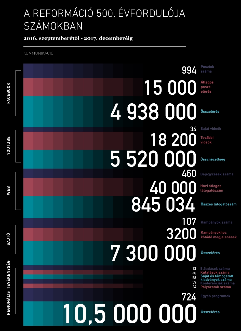A “Reformáció 500” projekt hírei összesen közel 10,5 millió emberhez értek el, míg a 3200 megjelenésnek köszönhetően az online sajtóban több mint 7 millió ember követhette a jubileumi eseménysorozat aktualitásait. Országszerte és határon túl is 24 különböző pályázatra lehetett jelentkezni az emlékév folyamán, valamint közel 730 program; előadások, kiállítások és konferenciák tették lehetővé, hogy szinte a teljes magyar lakosság megismerhesse és tudatosítsa az 500 éves reformáció értékeit.