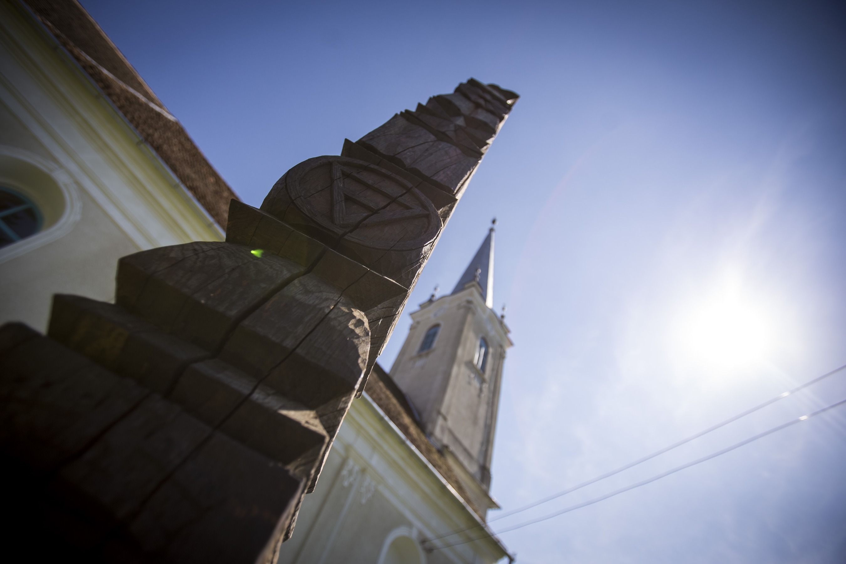 A templomkertben megtorpanunk, az épület előtt áll ugyanis a „találkozások kopjafája”, amelyen a település összes jellegzetessége szerepel: a falu első, 1392-es feljegyzésének dátuma, az erdélyi címer, háttérben pedig a reformátusság. „Hitben és nyelvében él a nemzet” – hirdeti a kopjafa alján egy márványtábla az örök igazságot. Szintén a kertben kapott helyet a településről származó Baczkamadarasi Kis Gergely, a székelyudvarhelyi református kollégium egykori igazgatójának szobra is.